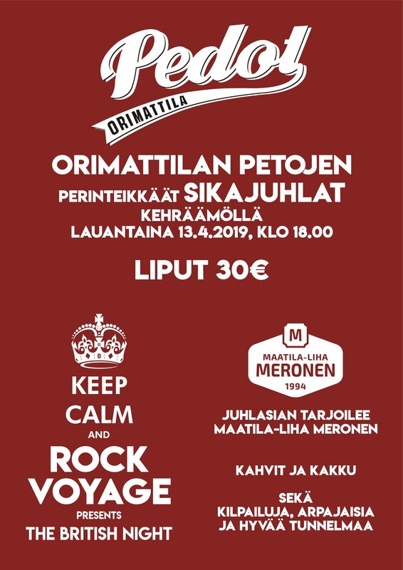 Orimattilan Petojen perinteikkäät Sikajuhlat kehräämöllä lauantaina 13.4 klo 18.00 Juhlasian tarjoilkee Maatila - Liha Meronen Kahvia ja kakkua sekä kilpailuja, arpajaisia ja hyvää tunnelmaa Musiikki Rock Voyage - show The British Night Liput: 30euroa Lippuja edustusjoukkueen pelaajilta tai petri.marjamaki@orimattilanpedot.fi, puh. 0405154481 |