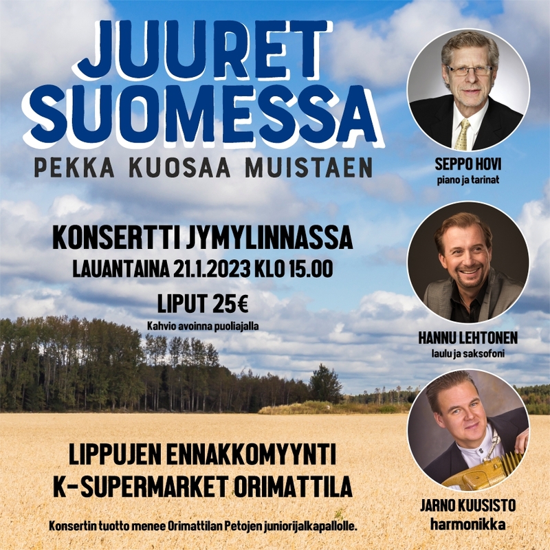 Juure Suomessa konsertti - Jymylinnassa lauantaina 21.1.2021 klo 15.00, Pekka Kuosaa muistaen Seppo Hovi, piano ja tarinat Hannu Lehtonen, laulu ja saksofoni Jarno Kuusisto, harmonikka Liput 25 euroa, kahvitarjoilu väliajalla, omakustantainen LIPPUJEN ENNAKKOMYYNTI K-SUPERMARKET ORIMATTILA JA OVELTA Lipputiedustelut: Petri Marjamäki, puh. 0405154481, petri.marjamaki@orimattilanpedot.fi Konsertin tuotto menee Orimattilan Petojen juniorijalkapallolle LiitteetLiitteet