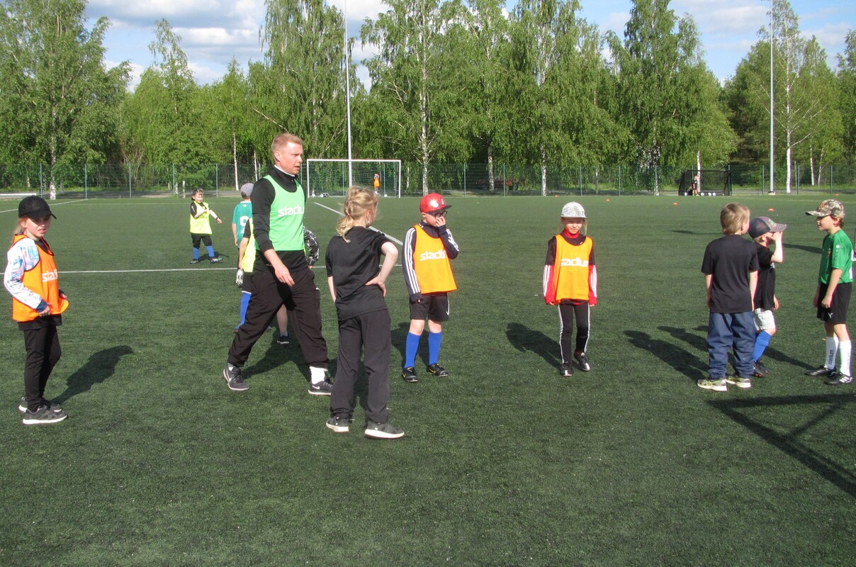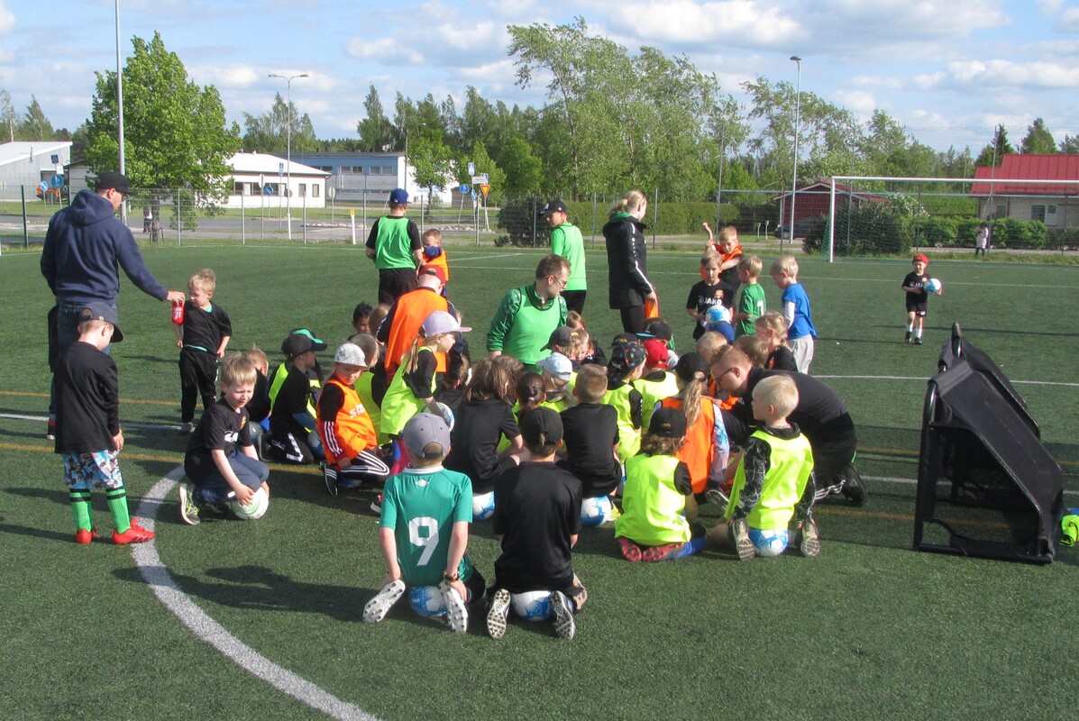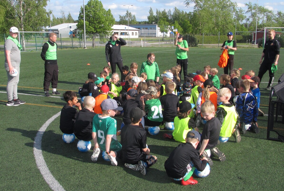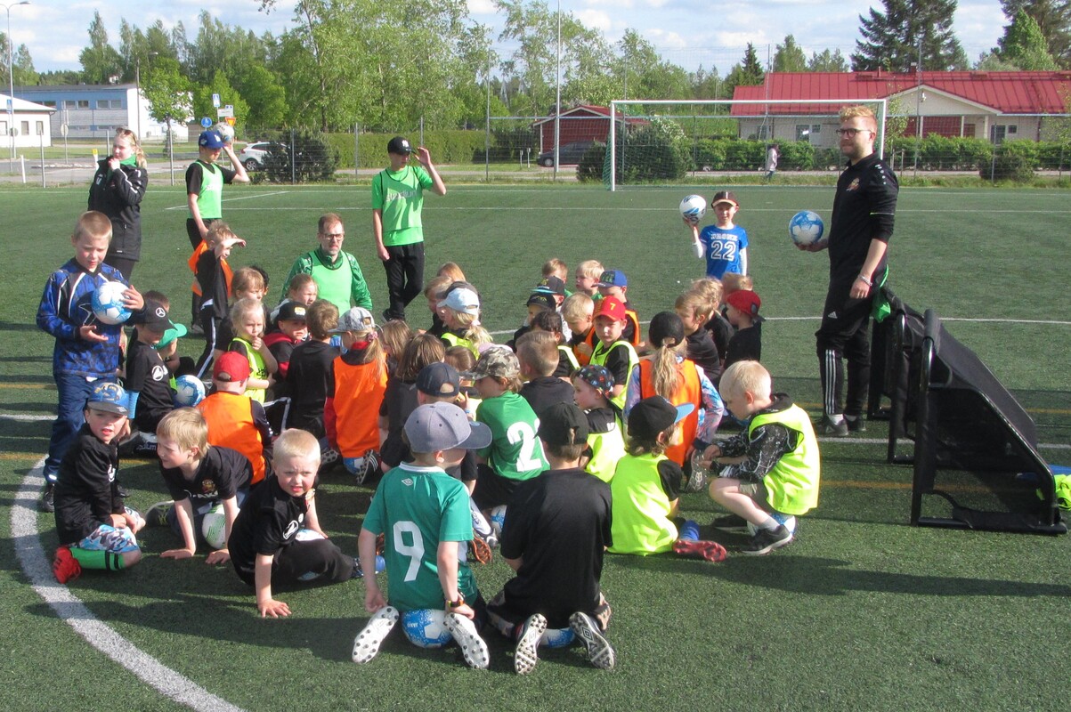 54 innokasta pelaajaa aloitti jalkapallokoulun tänään maanantaina. Koulu jatkuu joka päivä perjantaihin saakka ja heinä-elokuun vaihteessa jatketaan vielä toinen viikko. Heti alkuun jaettiin jokaiselle omaksi jalkapallokoulun osallistumispaita sekä pelipallo.