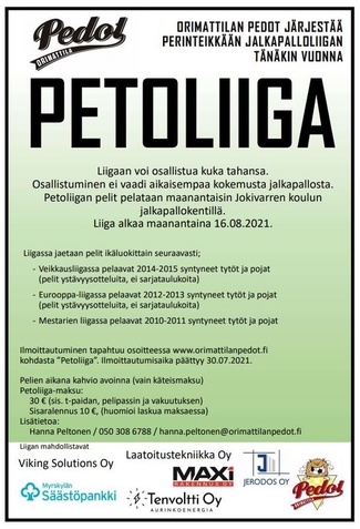 Uutinen sivuilla ennen Petoliigan alkua: Valtioneuvoston, THL:n ja Palloliiton ohjeet tapahtumien järjestämisestä vallitsevissa poikkeusolosuhteissa asettavat määräyksiä, joiden noudattamiseen ei ole käytännössä mahdollisuutta niin kauan ne ovat voimassa. Tämä tarkoittaa, että tämän vuoden 2021 Petoliiga siirretään kokonaisuudessaan pelattavaksi elo-syyskuussa. Petoliiga 2021 käynnistyy 16.8.2021. Ilmoittautuminen avattu alla olevassa linkissä. PETOLIIGA 2021 ILMOITTAUTUMINEN Täytä ilmoittautumistiedot ja tulosta osallistumislasku itsellesi. Muista vähentää mahdollinen sisaralennus laskun loppusummasta. Maksa osallistumismaksu eräpäivään mennessä. Huom. Petojoukkueissa pelaavat ilmoittautuvat myös, mutta osallistumismaksu sisältyy kausimaksuun. Ilmoittautuminen päättyy 30.7.2021, joten ilmoittaudu hyvissä ajoin ja maksa osallistumismaksu linkin lomakkeen ohjeistuksen mukaisesti. |