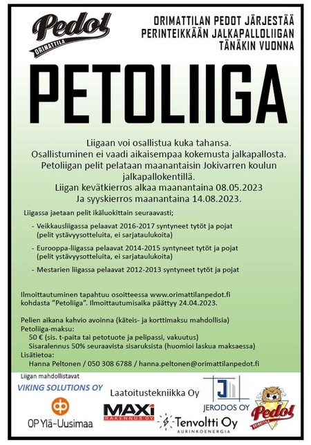Petoliigaan ilmoittautumislinkki: PETOLIIGA 2023 ILMOITTAUTUMINEN