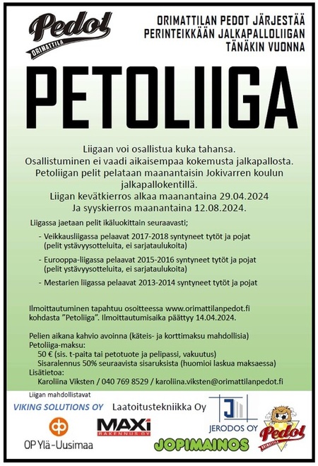 Petoliiga on Orimattilan Petojen järjestämä jalkapallosarja, johon kootaan ilmoittautuneitten kesken alueelliset joukkueet ikäryhmittäin. Veikkausliigaa pelaavat 2017-2018 syntyneet, Eurooppaliigaa pelaavat 2015-2016 syntyneet ja Mestareiden liigassa pelaa 2013-2014 syntyneet tytöt ja pojat. Joukkueiden väliset ottelut järjestetään kevätkierroksen osalta toukokuussa ja syyskierroksen osalta elo-syyskuussa Jokivarren koulun kentillä. Varsinainen pelipäivä on pääsääntöisesti maanantai klo 17:00-20:00 välisenä aikana.
